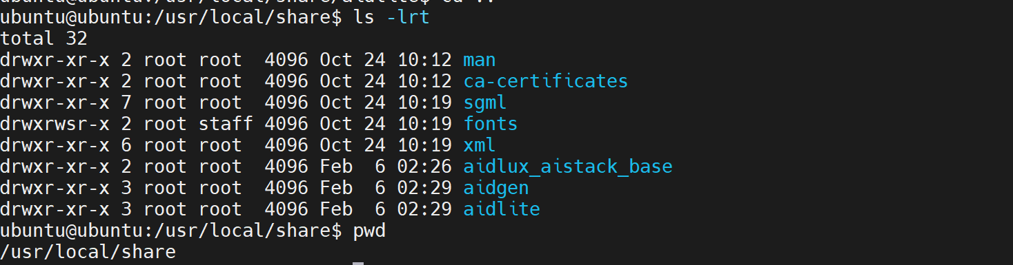 sudo ln -s /usr/lib/aarch64-linux-gnu/libOpenCL.so.1 /usr/lib/aarch64-linux-gnu/libOpenCL.soAfter installation, check that the /usr/local/share directory now includes the aidlite and aidgen folders.