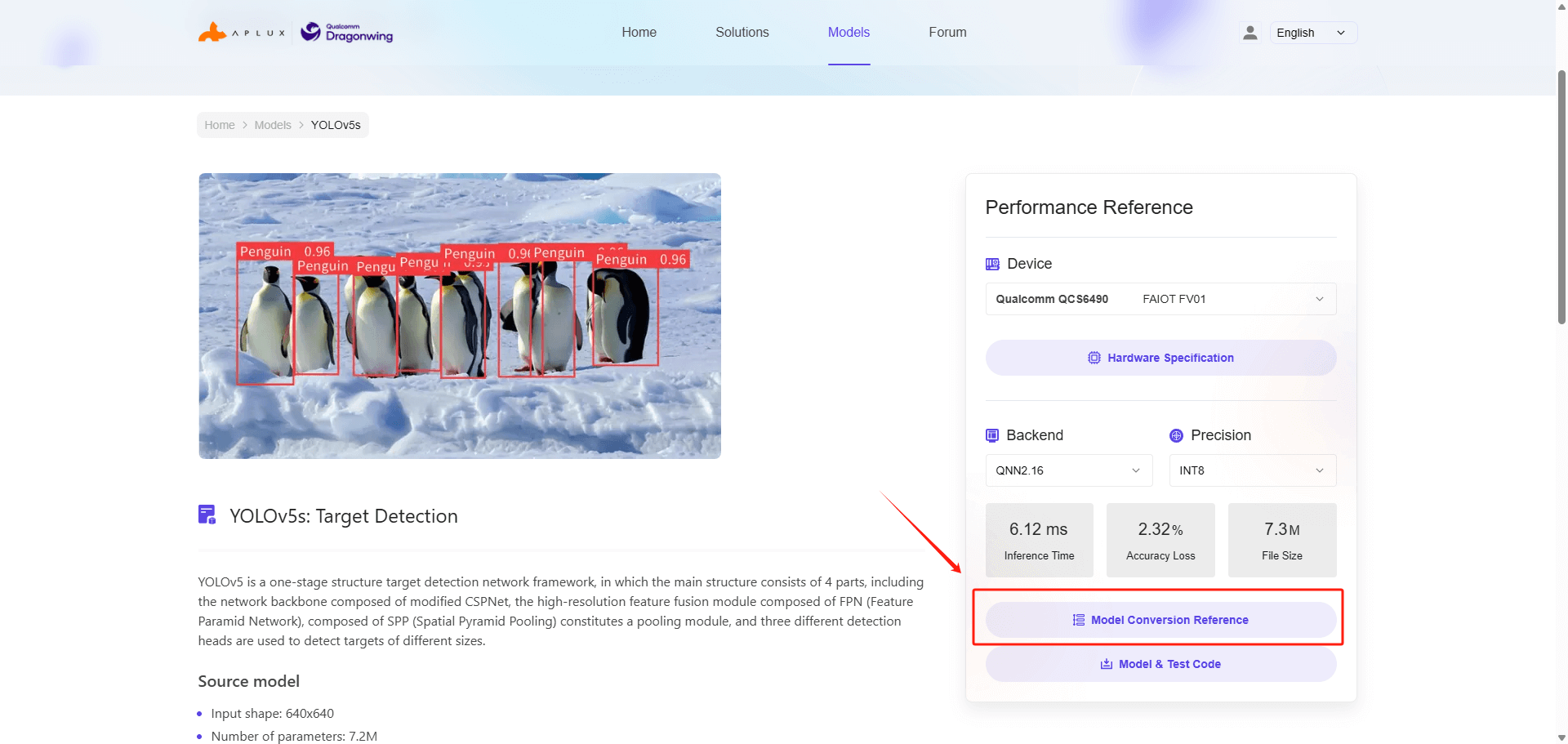 Enter the model detail page and click the Model Conversion Reference button under the performance section on the right
