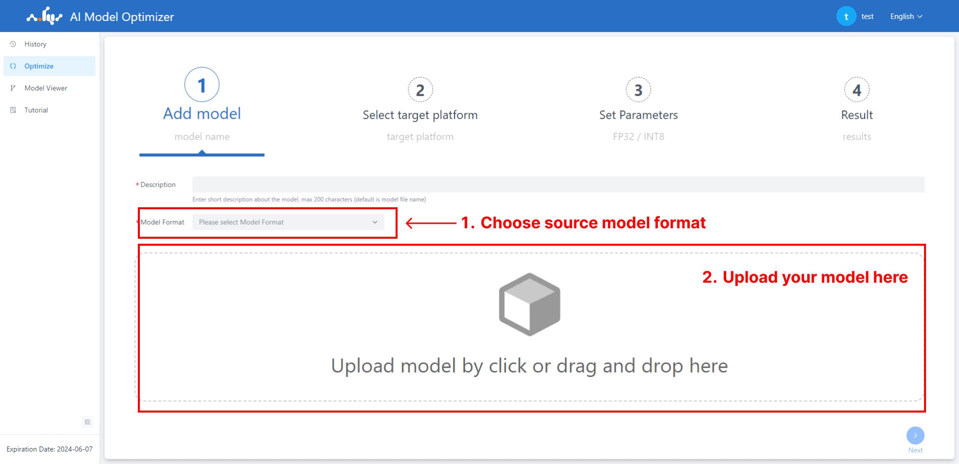 First, select the source model format, then drag and drop or click to upload the model to AIMO.