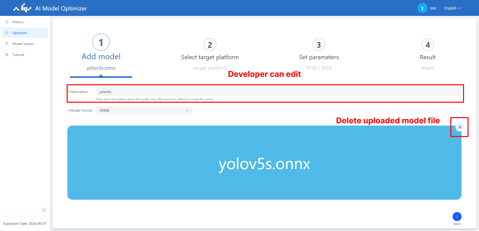 After a successful upload, the page will appear as shown below. The Description field will be auto-filled based on the model filename, and developers can manually edit it.