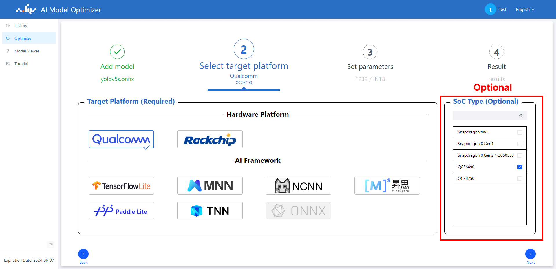 In this step, select the target platform. When the developer selects an option from the Hardware Platform, the Chip Model section on the right will display the supported models, as shown below: