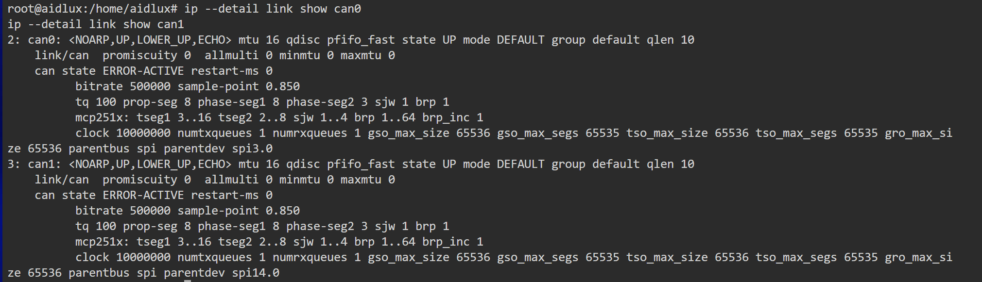 执行如下指令,完成can0 和 can1 配置