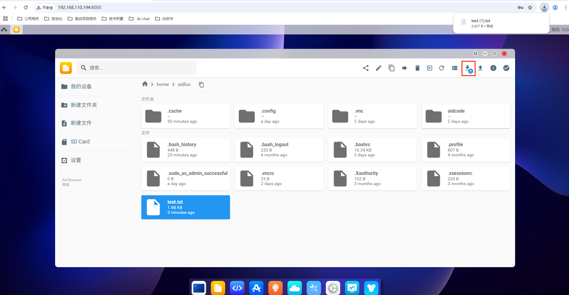 点击右上角下载按钮,将 /home/aidlux 目录下的文件或目录下载到本地