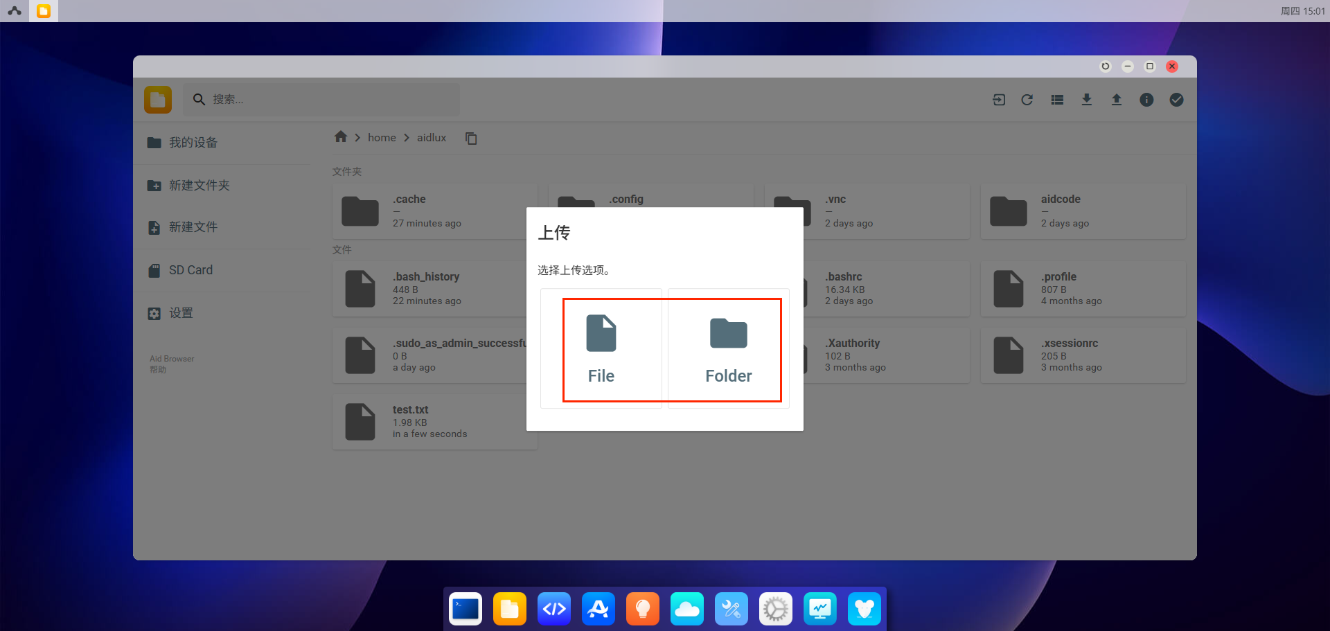 点击右上角上传按钮,传入文件或目录到 /home/aidlux 目录下
