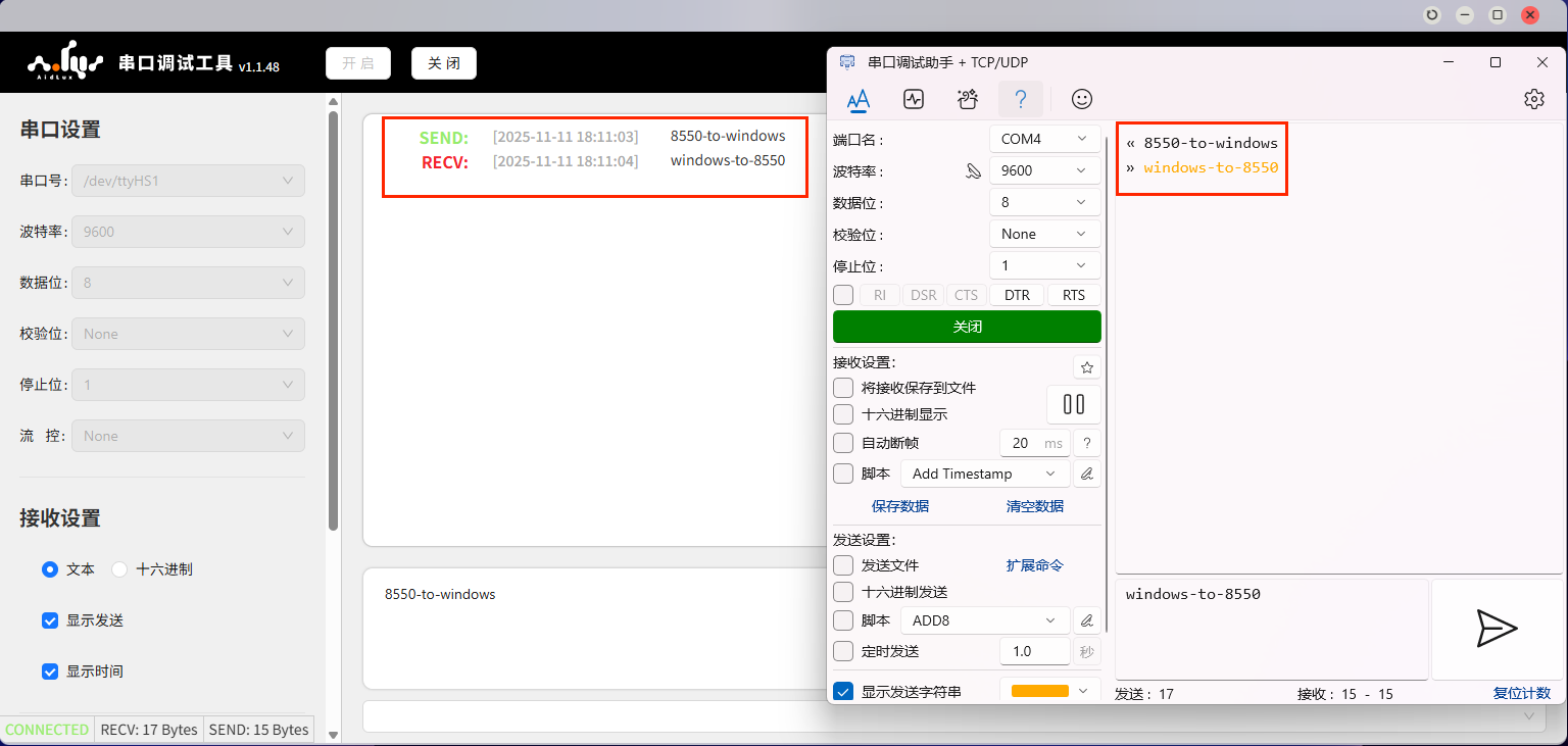 • 打开 Windows 电脑的串口调试工具,选择接入的端口,波特率设置为 9600,打开端口。