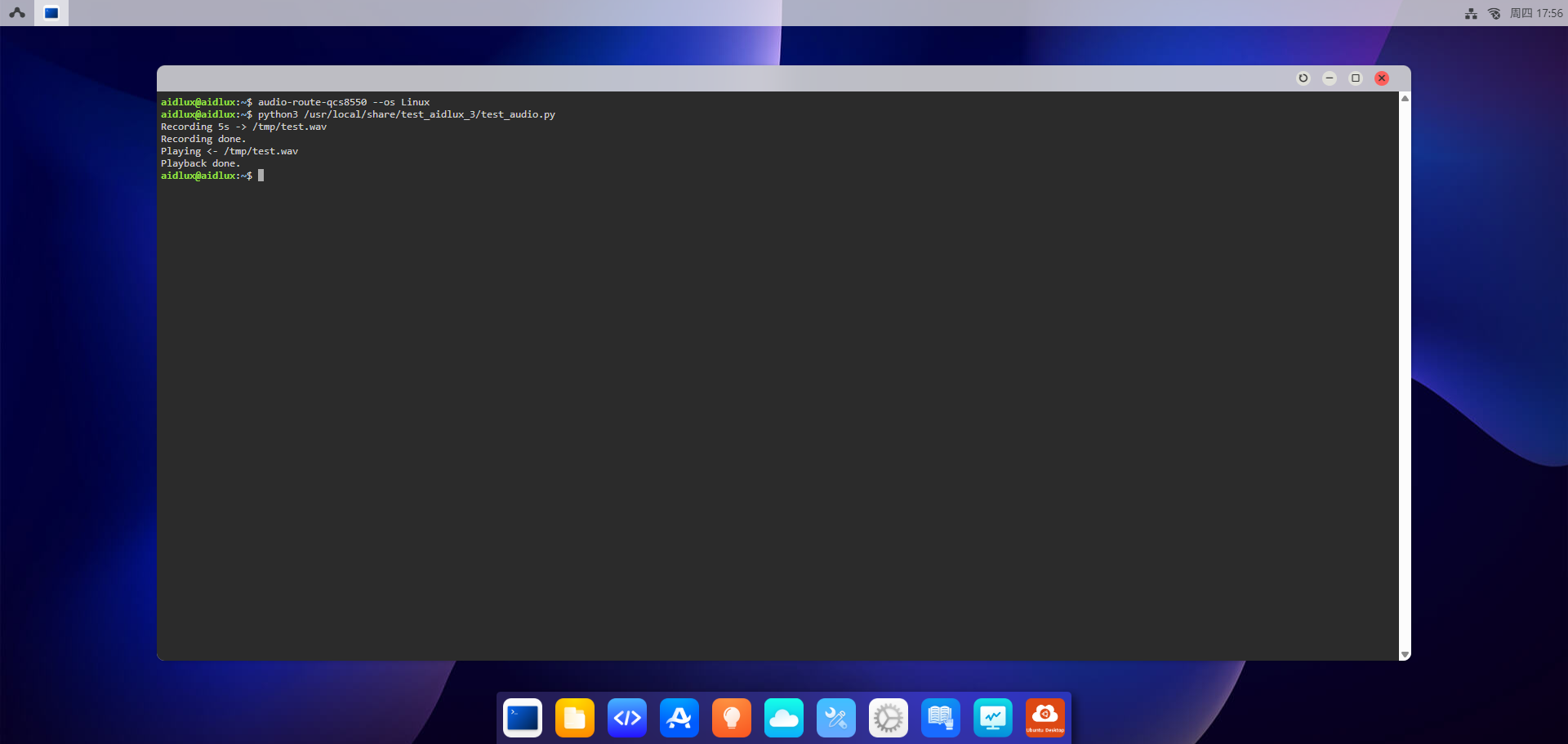 python3 /usr/local/share/test_aidlux_3/test_audio.py执行脚本后,会自动开录音 5s 然后自动播放录制的音频。