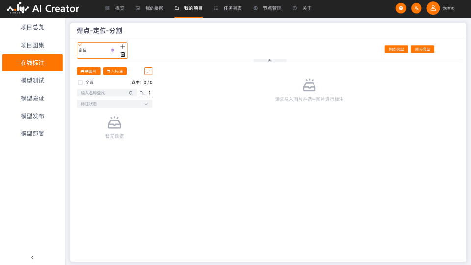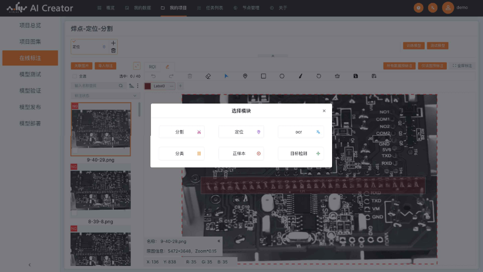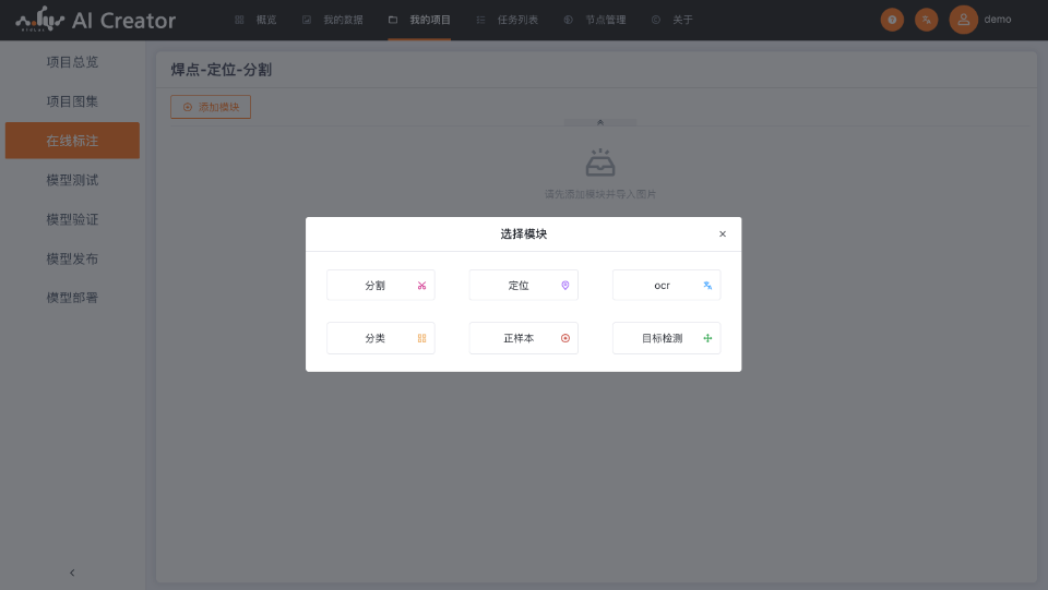 进⼊项⽬,点击左侧“在线标注”,再点击“添加模块”,选择我们需要训练的算法,例如:定位