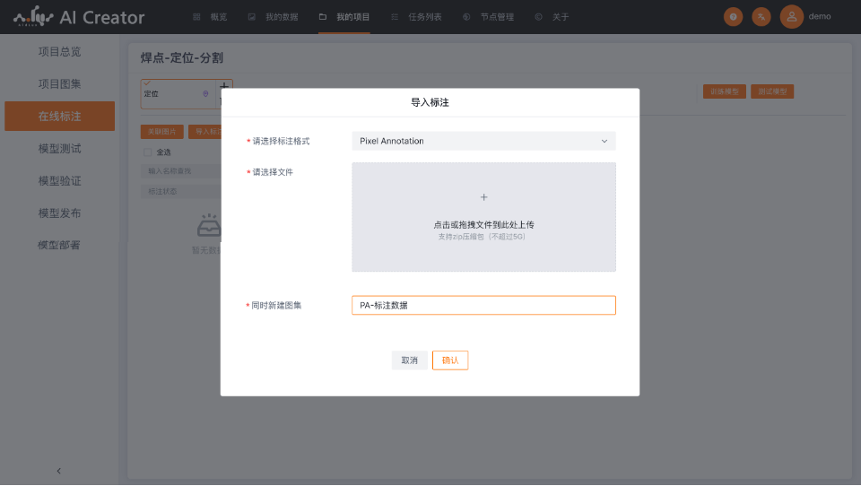 - 选择 Pixel Annotation 类型,⽂件⽀持 zip 格式,选择⽂件上传,并输⼊新建图集名称,然后点击确认