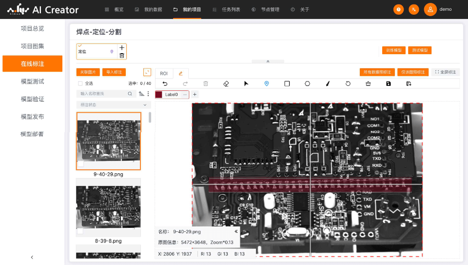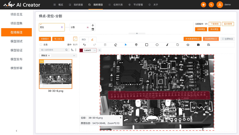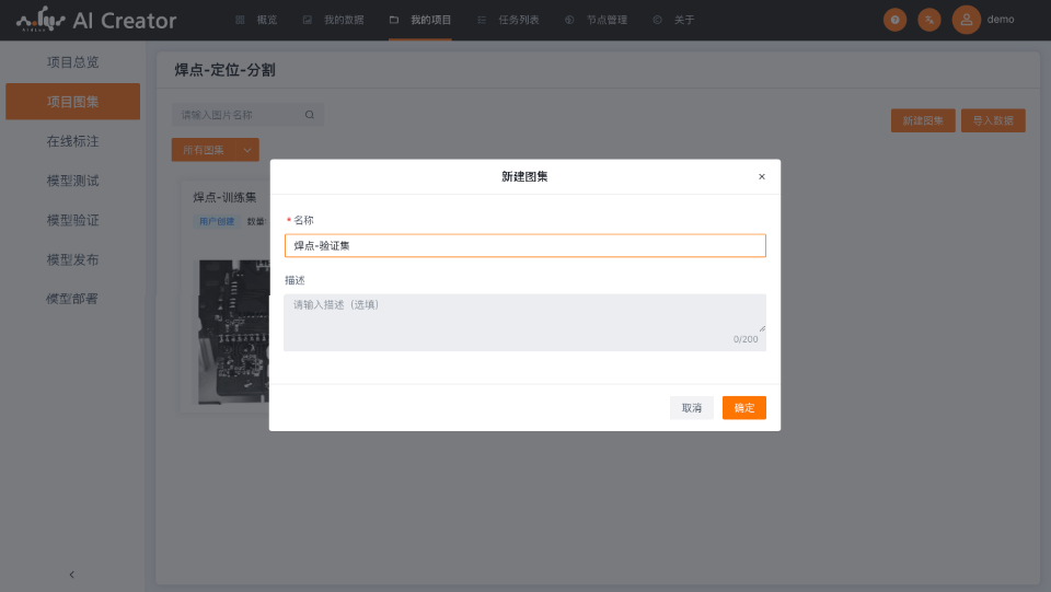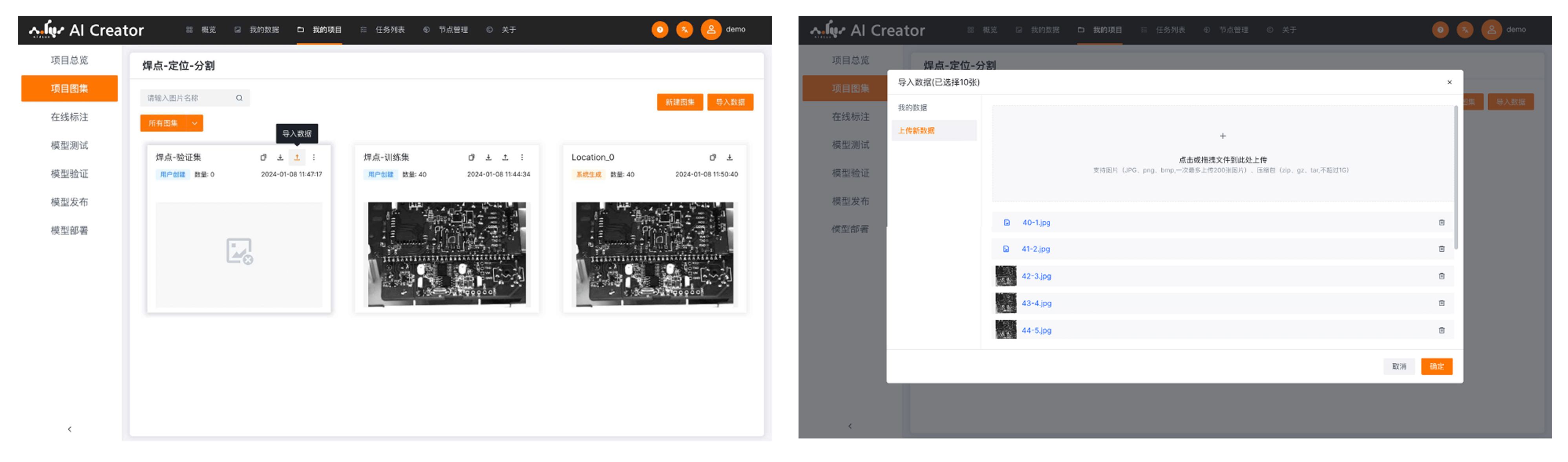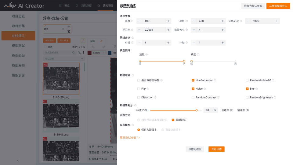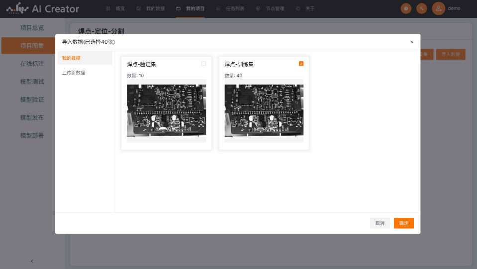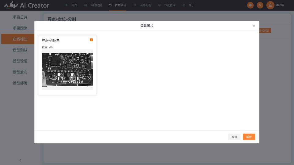 - 点击关联图⽚,选择项⽬图集,如:焊点-训练集
