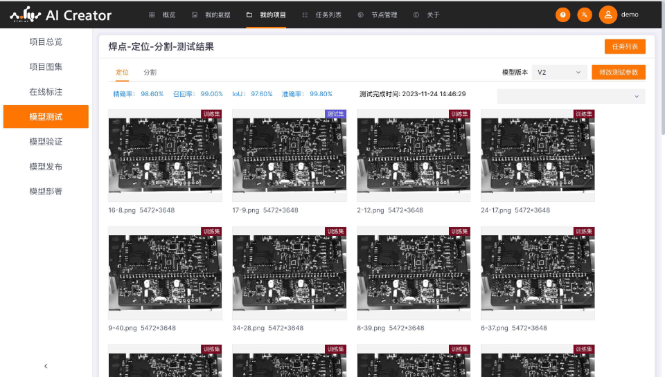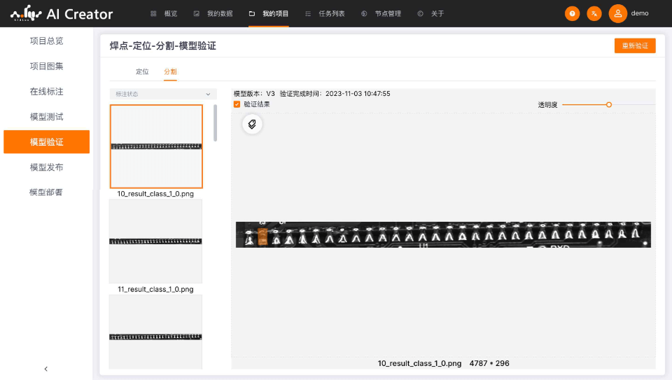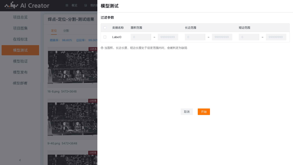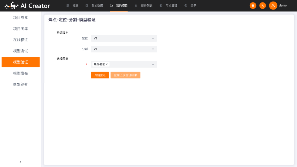 - 点击项⽬列表或项⽬标注界⾯的"模型验证"按钮,选择验证的模型版本和验证图集 (焊点-验证集) 进⾏验证