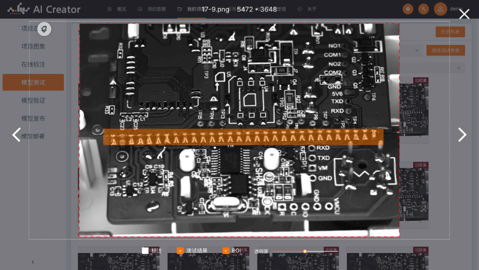 模型验证结果会叠加在原图上进⾏展⽰,可点击"验证结果"勾选,隐藏或显⽰模型验证结果,可以便捷和⾼效查看模型效果