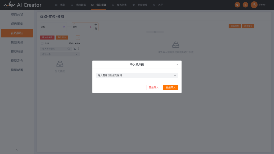 分割模块的图⽚数据取⾃前⼀模块的预测结果,当前置模块有新的测试结果更新时,"导⼊前序图"按钮将变为绿色并带有小红点