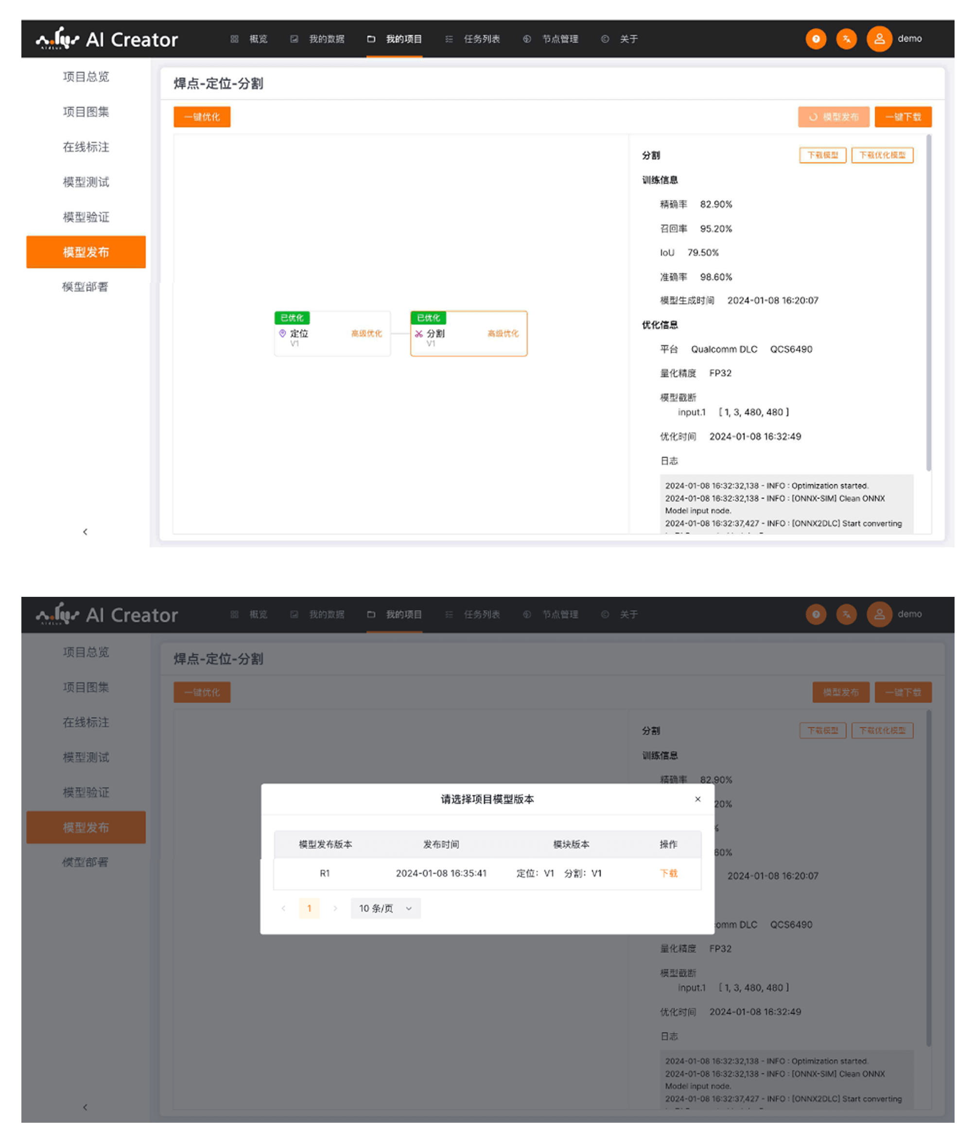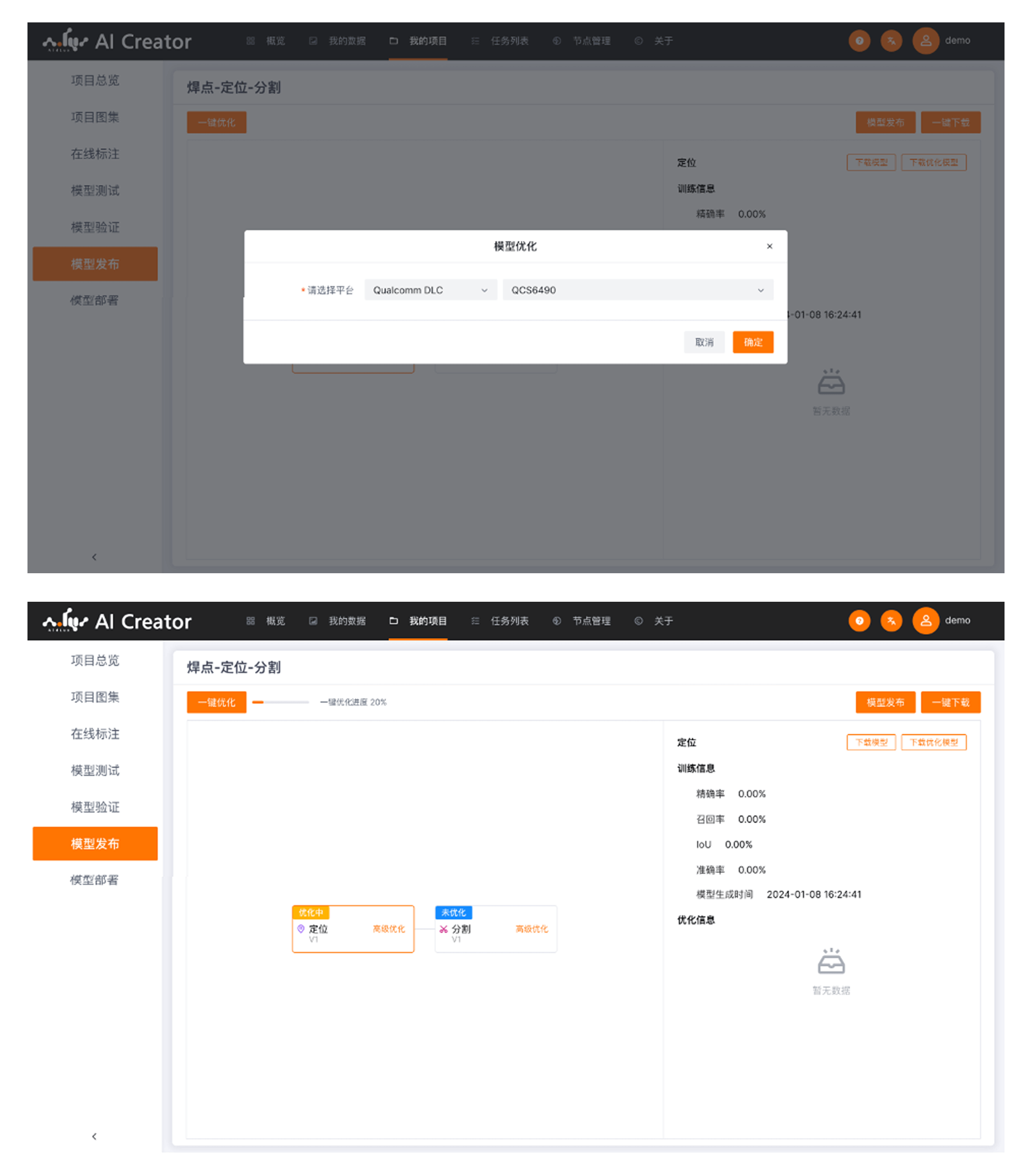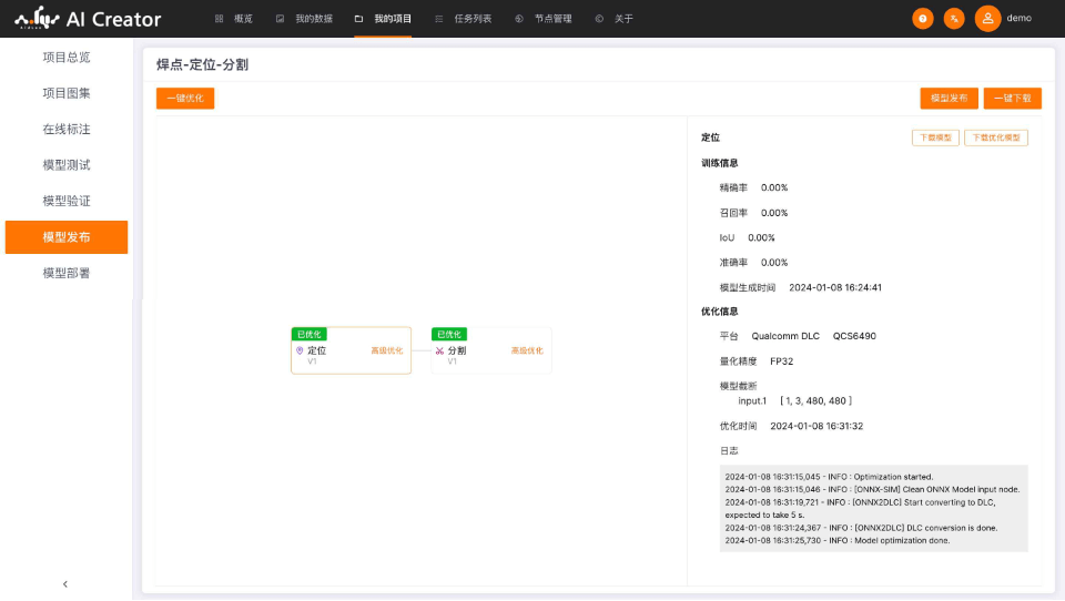在项⽬中,点击“模型发布”菜单,点击⼀键优化,选择优化选项。 按需选择需要优化的输出的平台或模型格式,AI Creator 会将训练好的模型通过 AIMO ⾃动优化