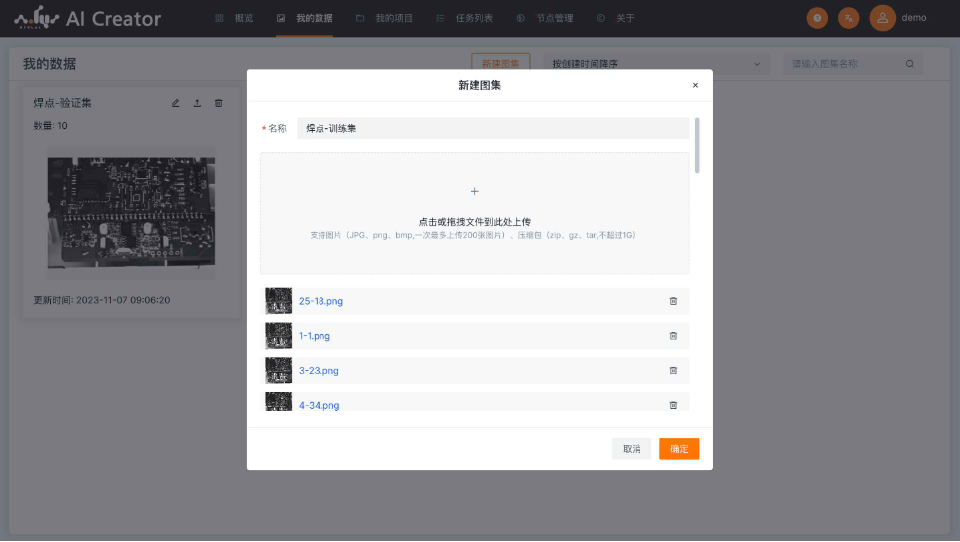 - 点击"新建图集",输⼊图集名称,选择本地准备的训练集图⽚,点击确定 图⽚⽀持 JPG、png、bmp 格式,⼀次最多上传 200 张图⽚,压缩包⽀持 zip、gz、tar,单个压缩包不 超过 1G