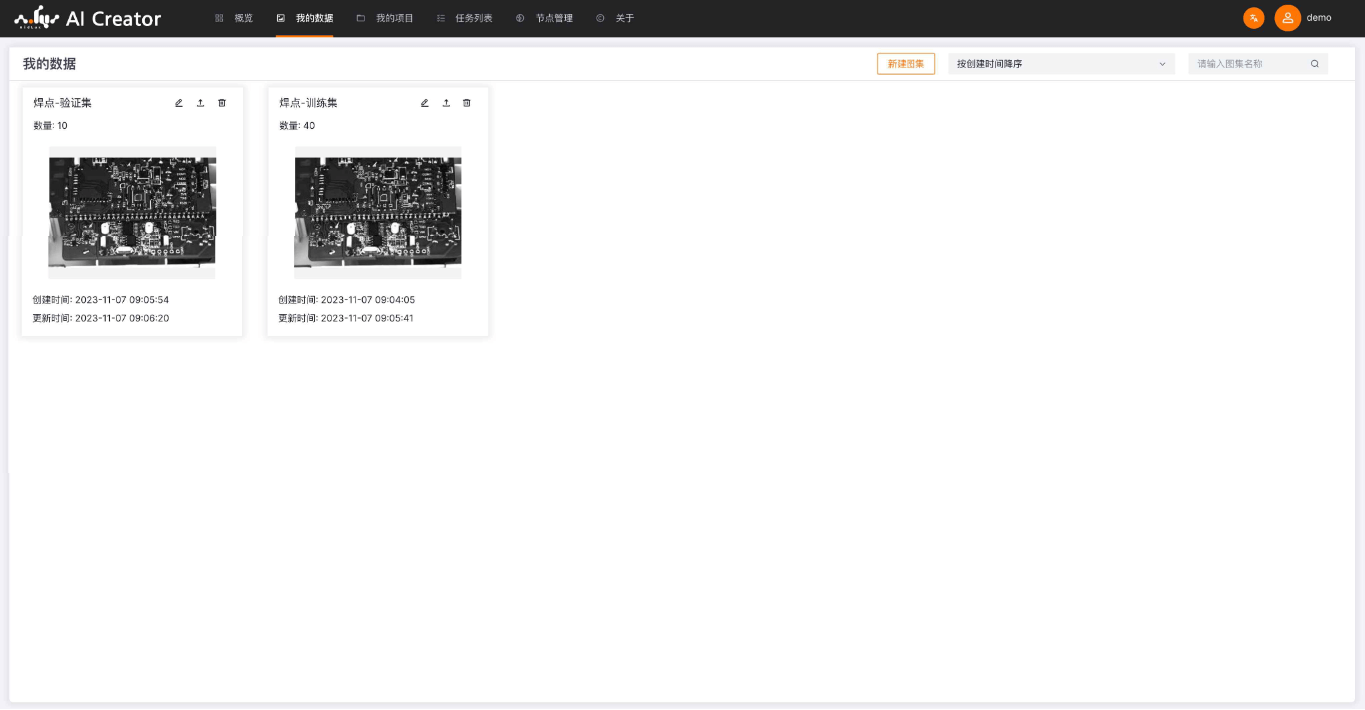 点击 AI Creator "我的数据"菜单栏,进⼊我的数据。 公共数据集,当前⽤⼾的所有项⽬均可使⽤。如果有需要多个项⽬⽤到同⼀份数据集,可以在我的数据中上传⼀份数据即可。