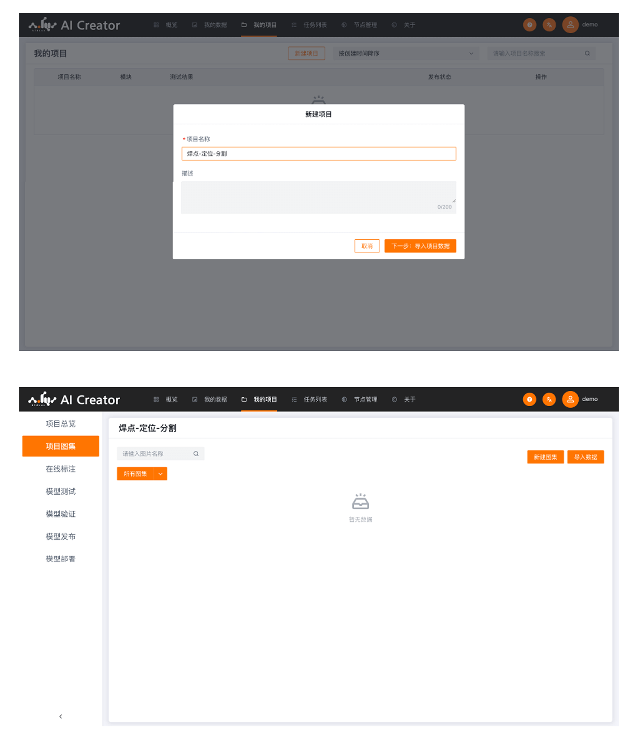 AI Creator 中图⽚管理分为我的数据和项⽬图集