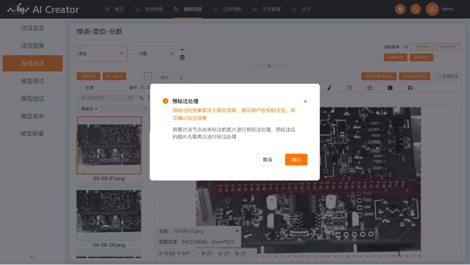AI Creator 2.1 新增预标注功能,针对已有优质模型,加样训练的场景,可以对新增图⽚或者模块未标注的图⽚进⾏预标注,快速完成标注。
