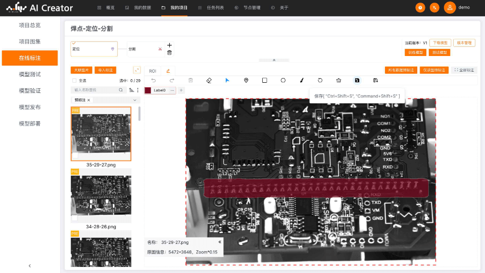 - 预标注完成后,需要依次查看图⽚预标注结果,确认标注⽆误,点击保存即可应⽤