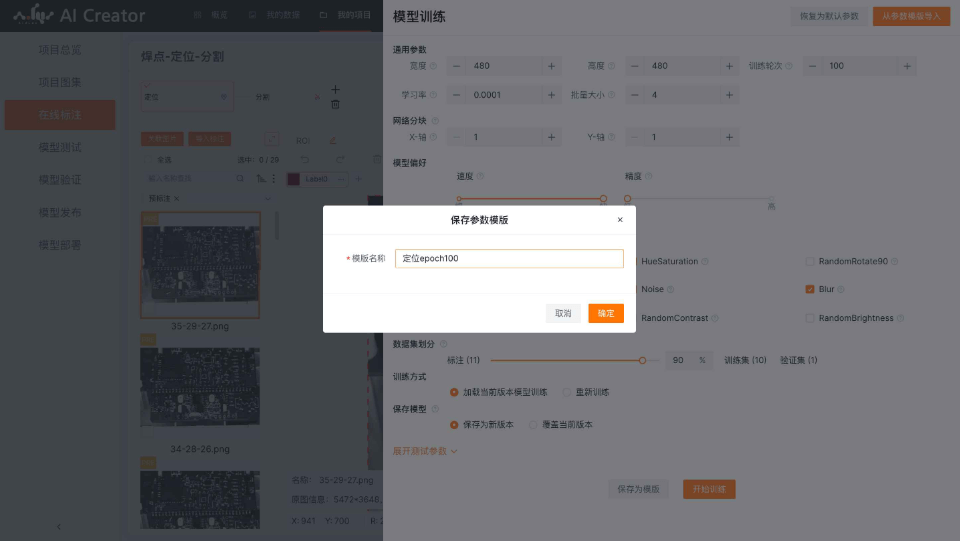 点击项⽬⼯作区“模型训练”,再点击“保存为模版”,输⼊模版名称即可保存