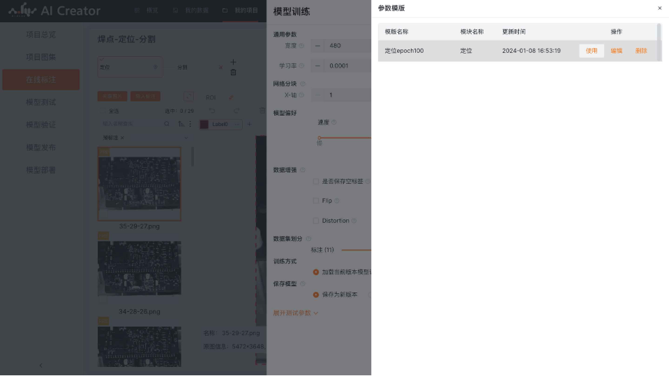 点击模型训练的“从参数模版导⼊”,再弹出的模版列表中选择要导⼊的模版即可